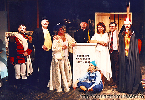 Ion Fiscuteanu (Efimiţa), Mihai Gingulescu (Leonida), Alexandru Pavel (Garibaldi), Claudia Domokoş (România rupându-şi cătuşele), Rareş Budileanu (Ţepeş), Bianca Fărcaş (Safta) şi Marius Damian (Cuza) în „Conu Leonida faţă cu reacţiunea" de I. L. Caragiale, regia Cristian Ioan, Teatrul Naţional din Târgu-Mureş.