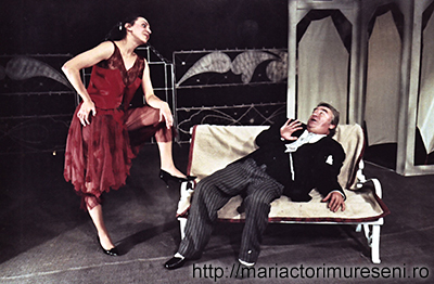 Ion Fiscuteanu, Monica Ristea, Serenela Mureşan, Mihai Gingulescu, Elena Purea şi Dan Glasu în „Cântăreaţa cheală" de Eugen Ionescu, regia Cristian Ioan, Teatrul Naţional din Târgu-Mureş.